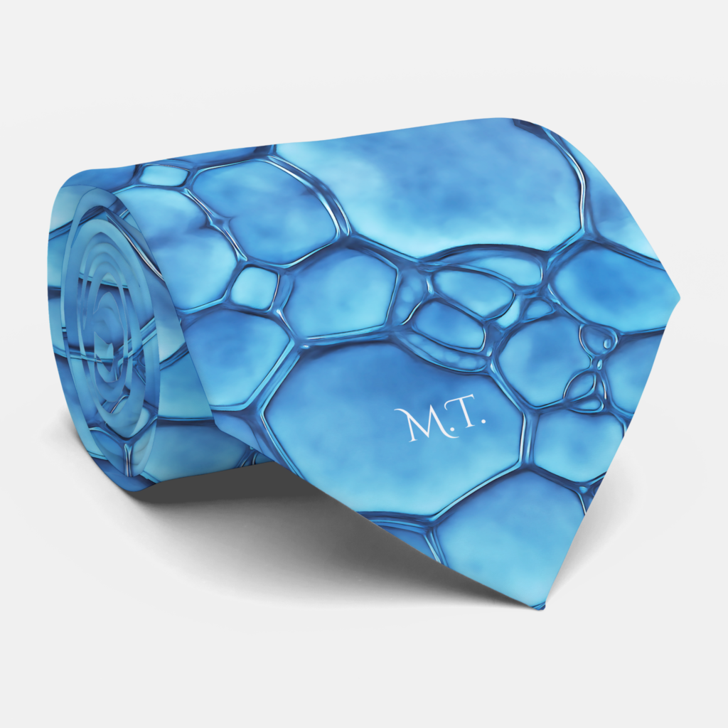 Inspired by the structure of water molecules, this blue tie features fluid, interconnected patterns that create a clean and modern visual effect. The monochrome palette keeps it refined, while the organic forms add subtle depth and movement.