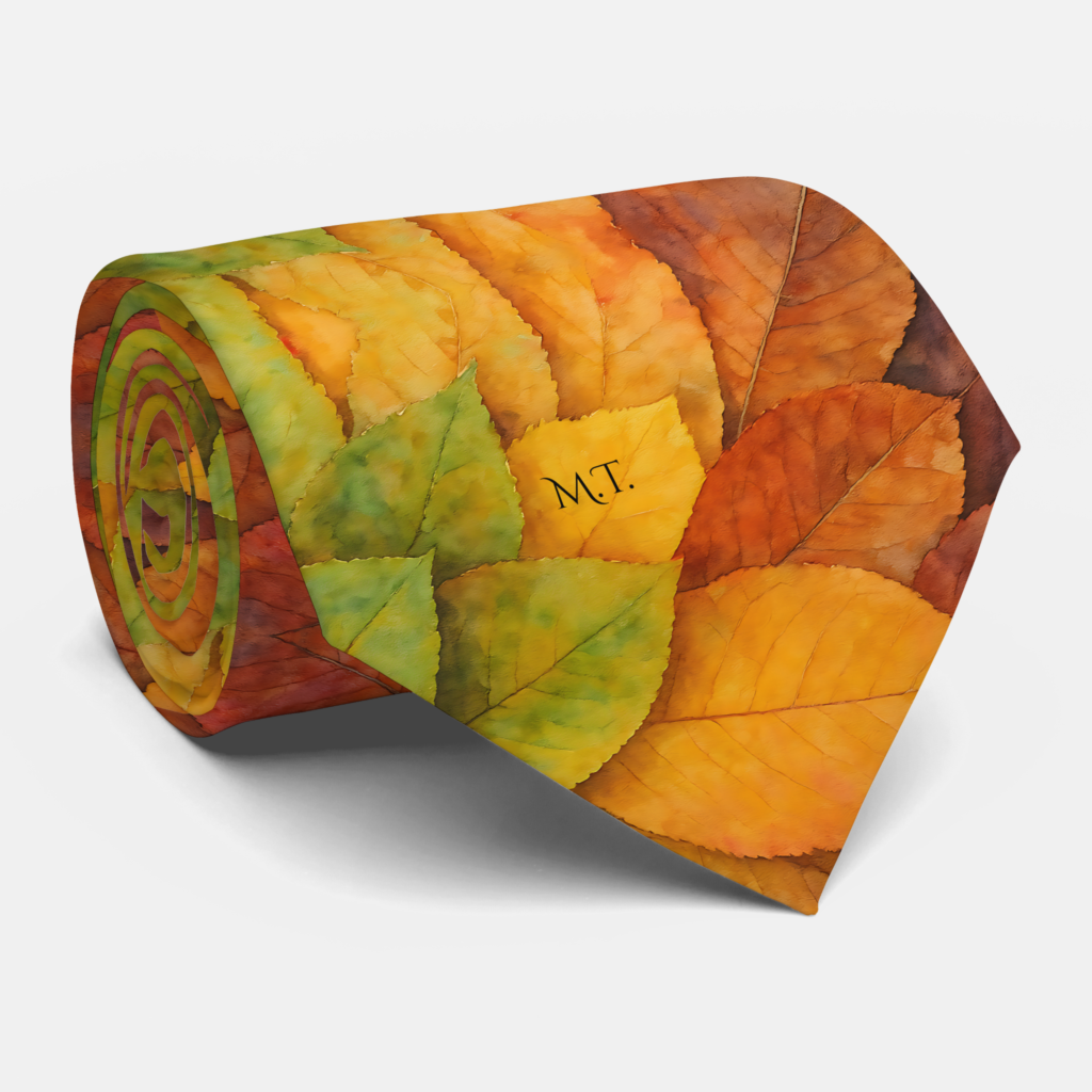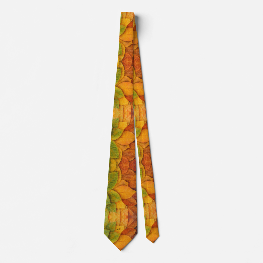 A vibrant tie featuring layered autumn leaves in rich shades of orange, yellow, and green, creating a warm and textured natural composition. The overlapping forms and color transitions bring depth and movement, making the design both bold and visually balanced.