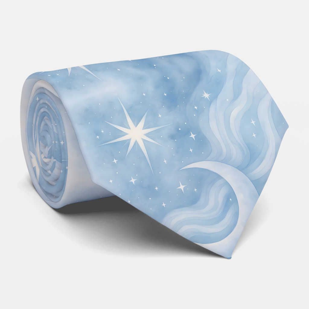 A dreamy blue tie featuring delicate moon and star elements set against soft, flowing textures inspired by the night sky. The light tones and subtle celestial details create a calm, elegant look with a touch of imagination.
