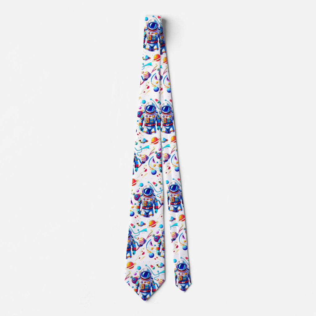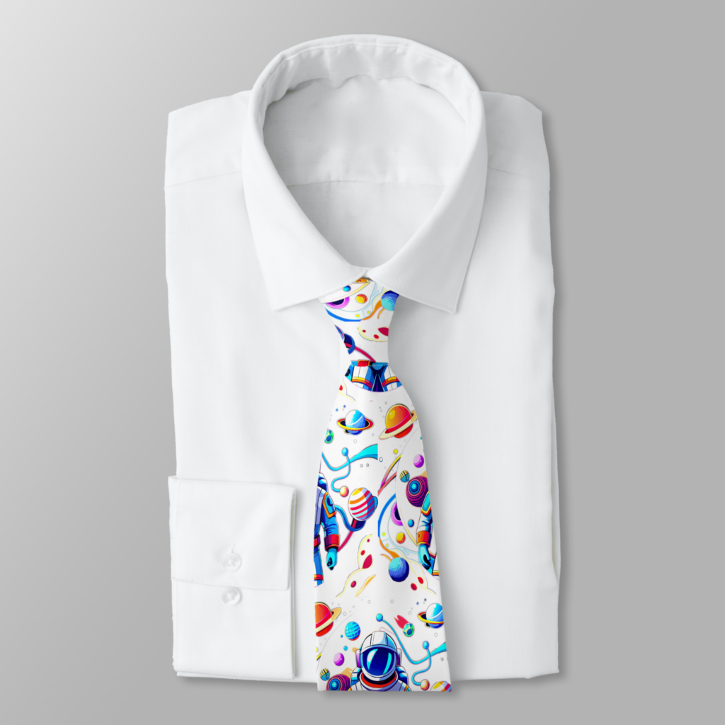 A fun and colorful tie featuring playful astronaut and space-themed elements, designed to bring personality and creativity into everyday style. The vibrant details and lively composition make it a standout accessory without feeling overwhelming.