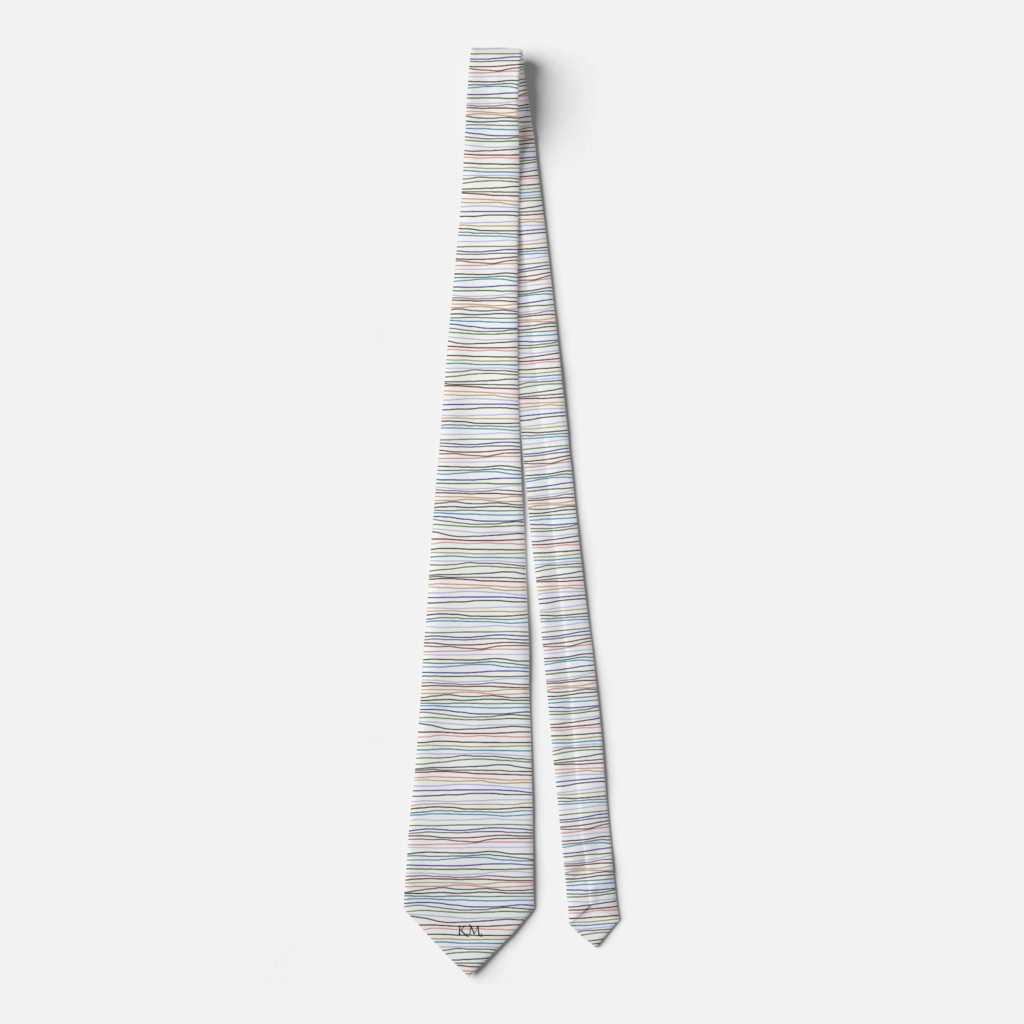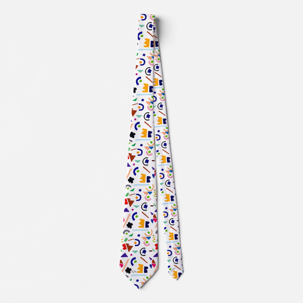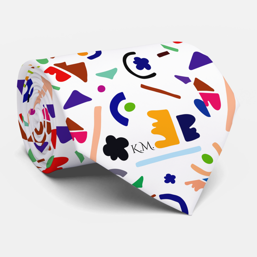 A playful tie featuring colorful doodle-style illustrations arranged in a clean, modern pattern, enhanced with a customizable monogram. The hand-drawn look adds a fun and creative energy while remaining easy to wear in different settings.