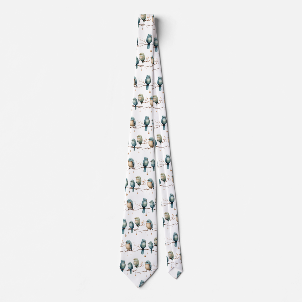 oft and charming tie featuring delicate bird illustrations in calming blue and neutral tones. The nature-inspired design creates a relaxed, elegant look that adds personality without being overwhelming.